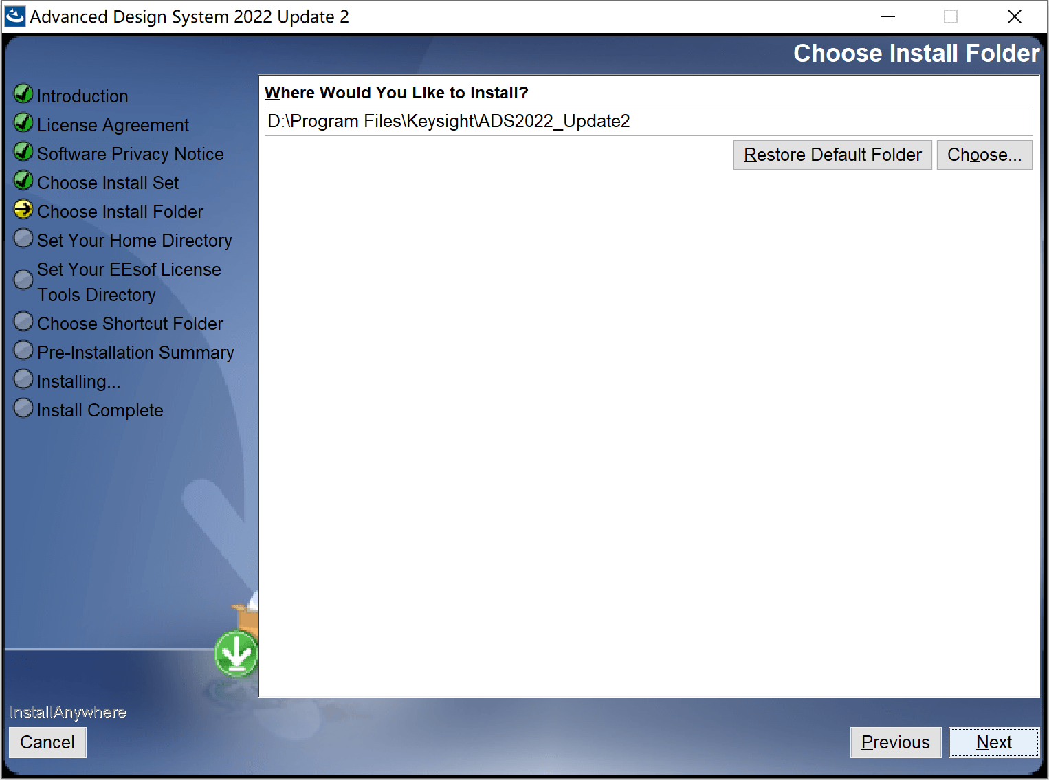 我知识兔将ADS安装到了D:\Program Files\Keysight\ADS2022_Update2,路径你随意,保持默认的设置安装到C盘也行