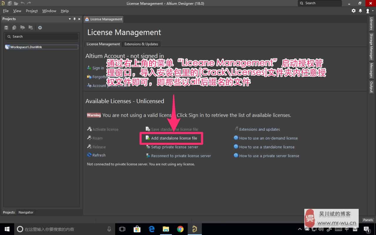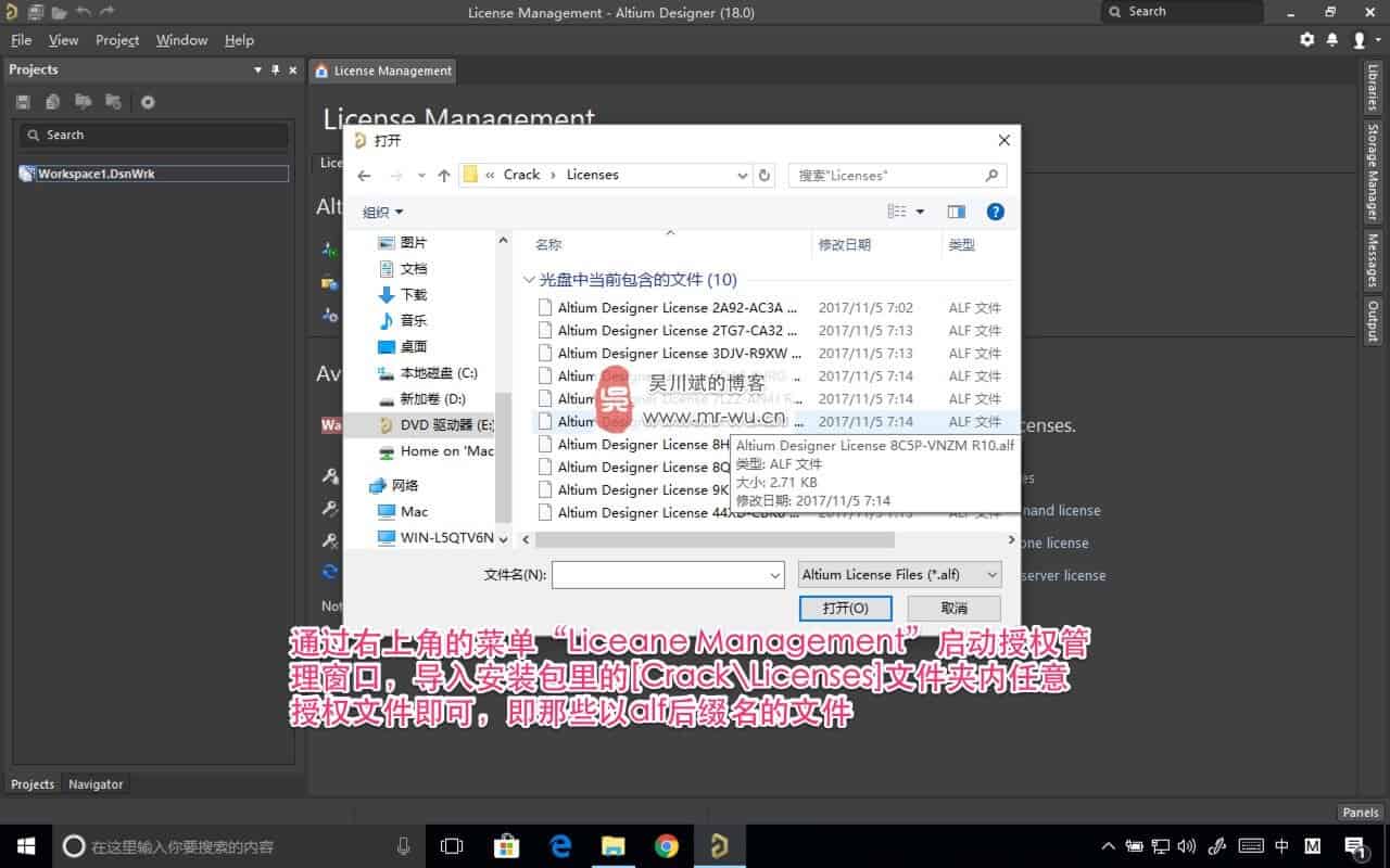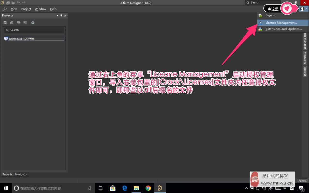 接着通过开始菜单栏启动Altium Designer 18,在AD 18中,通过右上角的菜单“Liceane Management”启动授权管理窗口,导入安装包里的[AD18和谐包\Licenses]文件夹内任意授权文件即可,即那些以alf后缀名的文件。