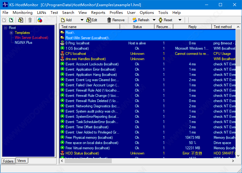HostMonitor可以根据需要在不同的日志文件中记录测试结果,具有不同的日志级别和不同的格式(HTML,文本,DBF或ODBC)。
