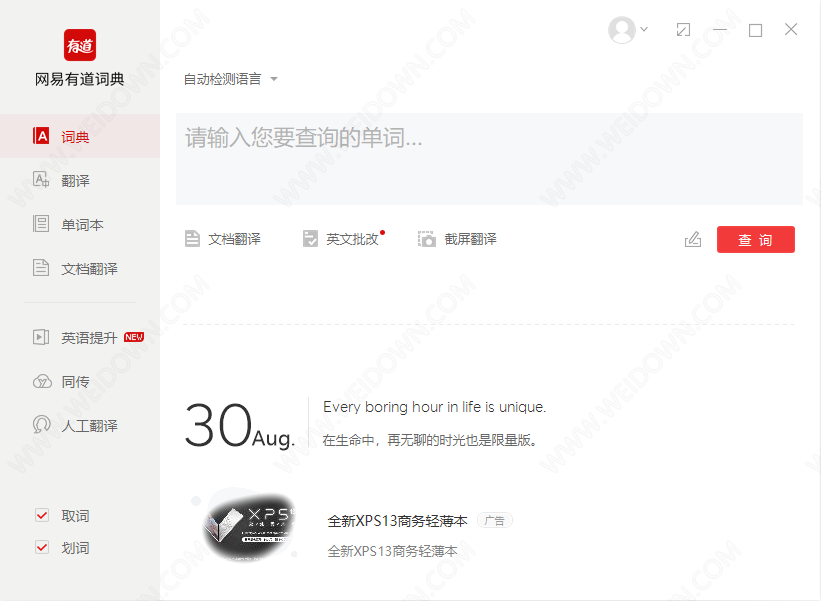 网易有道词典下载 – 网易有道词典 8.9.6.0 去广告解锁VIP绿色版 软件下载 11月 20, 2023 0 king 网易有道词典是一款免费的全能翻译软件,有道词典PC版结合了互联网在线词典和桌面词典的优势。 软件截图:软件介绍: 网易有道词典是一款免费的全能翻译软件。有道词典PC版结合了互联网在线词典和桌面词典的优势, 支持41种语言翻译,海量词汇,在线翻译,权威词典、汉语词典、强大的本地词典,“权威词典+网络释义”组合将各类新兴词汇和翻译收录其中,新增的全文翻译、百科全书及网络单词本让英文正式迈入互联网时代。 下载仅供下载体验和测试学习,不得商用和正当使用。 下载体验 请输入密码查看下载! 如何免费获取密码? 点击下载