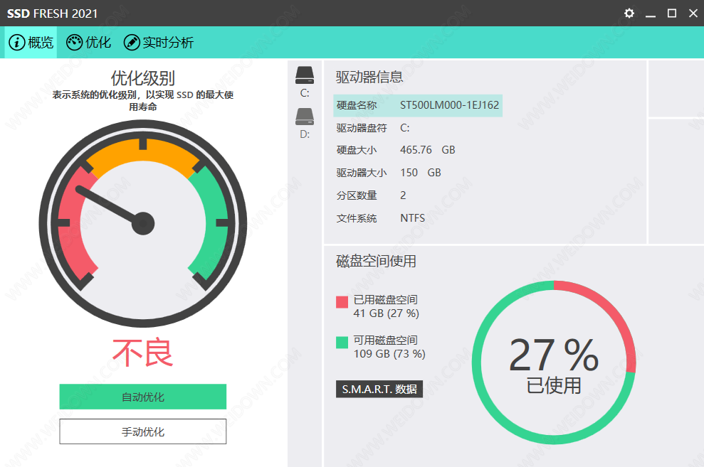 Abelssoft SSD Fresh 2021是目前互联网上非常优秀的一款功能强大并且知识兔非常实用的固态硬盘性能优化提升工具软件,通过该软件可以帮助用户快速优化系统SSD的使用,不仅可以延长固态硬盘的使用寿命,知识兔还能提升硬盘的性能。由于它们的构建方式,固态驱动器的预期寿命主要取决于写入的访问时间,尽量避免读写访问,减少读写操作次数,可延长固态硬盘的使用寿命,同时,尽量禁用一些不需要或者说是不必要的服务也能提高它的系统性能,而且知识兔它还可以随时进行自我监控,分析磁盘并进行详细的分析,将结果显示为完整的报告分享给用户,知识兔让大家可以清楚的了解和进行修正。