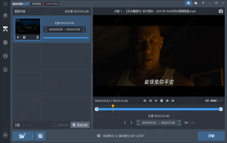 Bandicut中文名班迪剪辑是一款操作简单易懂且无损分割与拼接视频软件,极速分割出自己喜欢的精彩片段!同时你也可以快速的把一个大视频分割成多个均等小视频,方便上传。使用Bandicut,每一个人都可以快速轻松的从一个漫长而枯燥是视频中剪辑出自己喜欢的精彩片段!你也可以快速的把一个大视频分割成多个小视频,除去自己不喜欢的部分,比如广告、开头和片尾等画面,知识兔使用Bandicut你可以为所欲为的去剪辑记录属于自己的视频。班迪剪辑支持目前市场上几乎所有的视频文件格式,比如:AVI,MP4,MOV,M4V,MKV,MPEG,MPG,DAT,VOB,FLV??,ASF,WMV,TS,TP,TRP,MPE,MPV2,MP2V,M2T,M2TS,K3G, DIVX,WM,WMX,WVX,RM,RMVB,RAM,IVF,OGM,VP6,XVD。