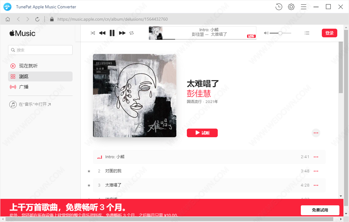 TunePat Apple Music Converter是专门为录制Apple Music的曲目并将其转换为常用格式以供离线播放而设计的。下载后,您可以在mp3播放器上欣赏苹果音乐歌曲,将其刻录到光盘上,或者与朋友分享。它不需要额外的应用,知识兔包括苹果音乐/ iTunes应用。只需使用TunePat Apple Music Converter,您就可以毫不费力地从Apple Music下载并转换任何曲目。